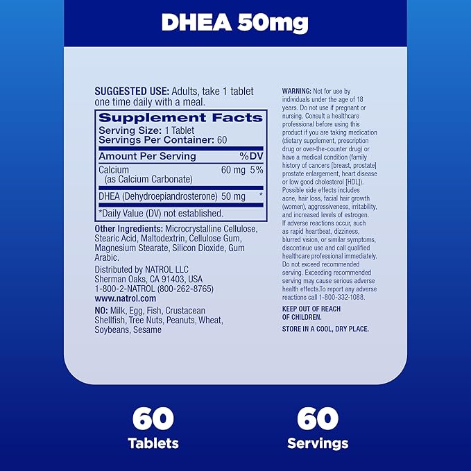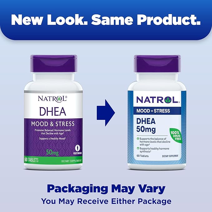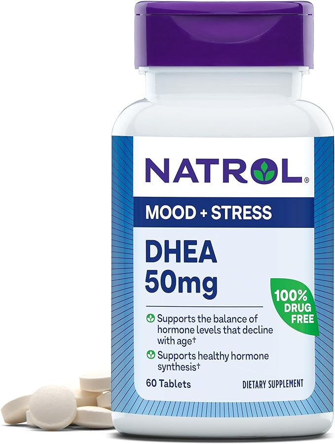 - Mood and hormone support supplement*: Contains one 60 count bottle of Natrol Mood & Stress DHEA 50mg Tablets for a 60-day supply