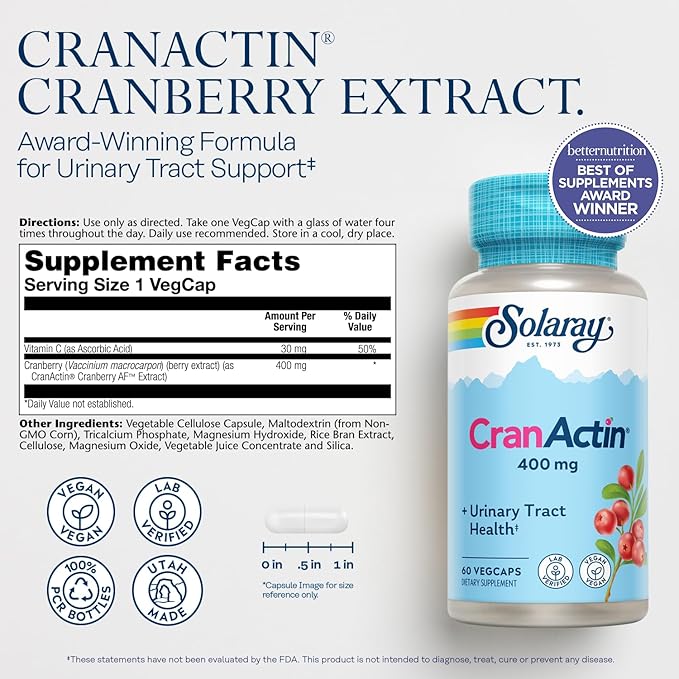 SOLARAY CranActin Cranberry Extract 400 mg - Cranberry Supplements for Women and Men - Bladder and Urinary Tract Health Support with Vitamin C - Vegan, 60-Day Guarantee, 60 Servings, 60 VegCaps
