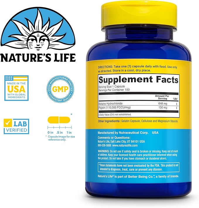 - Enzymes for Digestion & More – Formulated to support digestive health and stomach comfort, Nature's Life HCL Betaine with Pepsin supplies 648mg of Betaine Hydrochloride and 130mg of Pepsin per 1-capsule serving.*