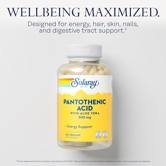 Solaray Pantothenic Acid 500mg - Vitamin B 5 - B Vitamin for Coenzyme-A Production, Energy Metabolism, Digestive Health, Hair Health, Skin and Nails Support - Vegan, 60-Day Guarantee - 250 VegCaps