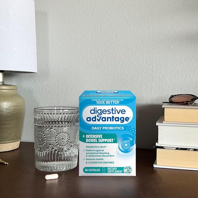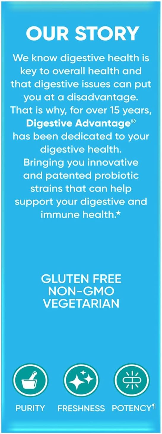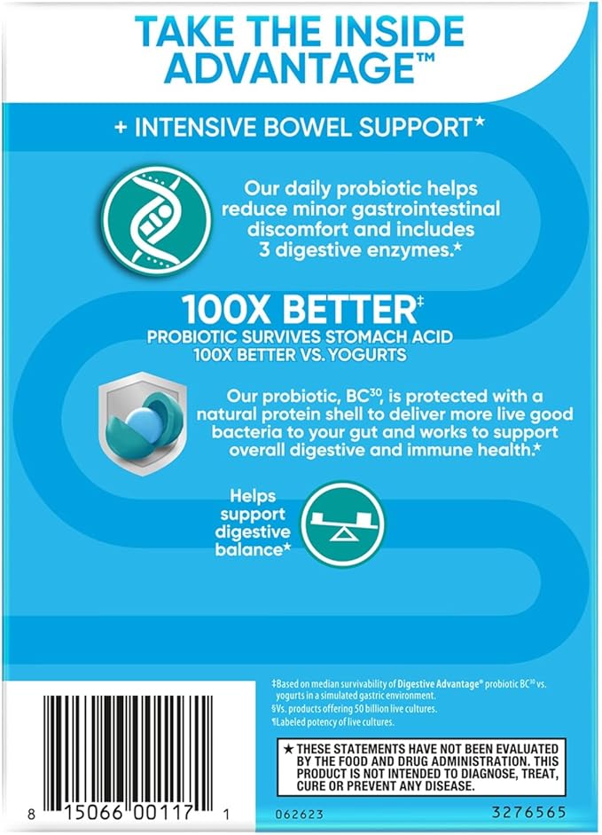 - TRUSTWORTHY INGREDIENTS: These probiotic + intensive bowel support capsules are GMO-Free & Vegetarian. Digestive Advantage products are guaranteed for freshness, purity, and labeled potency. 96 Day Supply!
