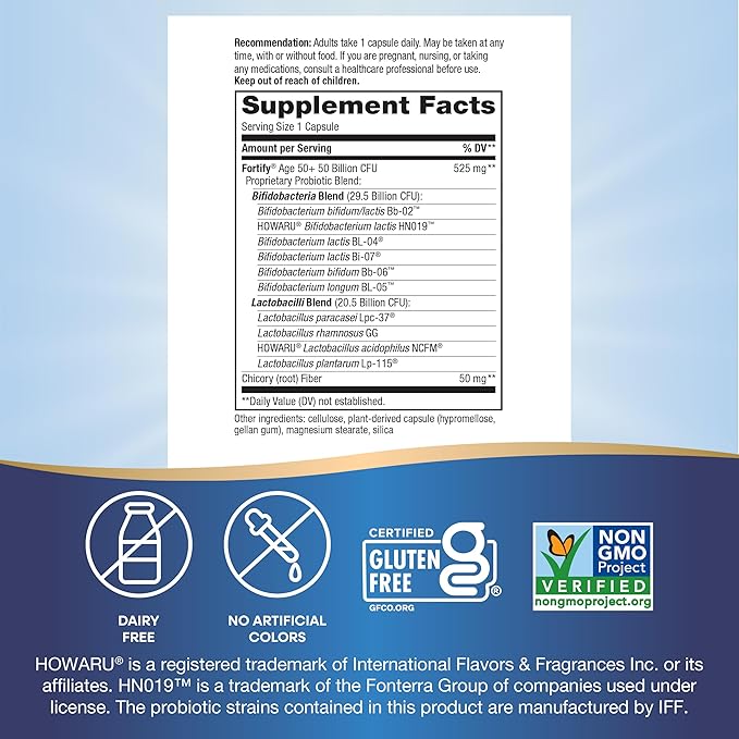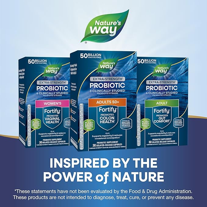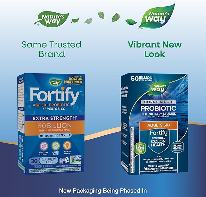 - Nature's Way Fortify Extra Strength** Adults 50+ 50 Billion CFU Daily Probiotic is formulated for adults 50+ with 11 probiotic strains. Support digestive, colon, and immune health.* Plus plant-based prebiotic fiber, food for good bacteria.*