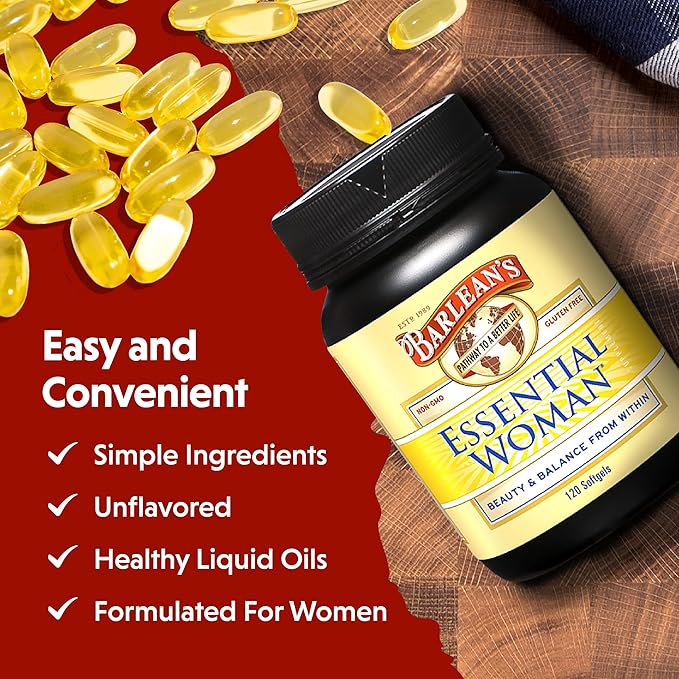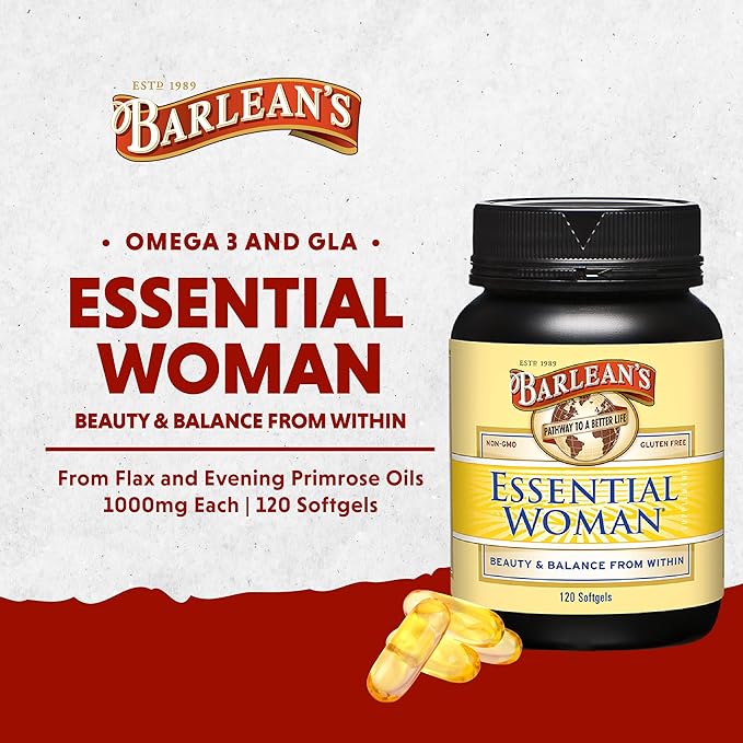 Barlean's Essential Woman Capsules, Hormonal Balance Supplement for Women, Flaxseed, Evening Primrose Oil & Soy Isoflavones, Omega 3 6 9 and GLA for Healthy Hair and Skin, 120 Count