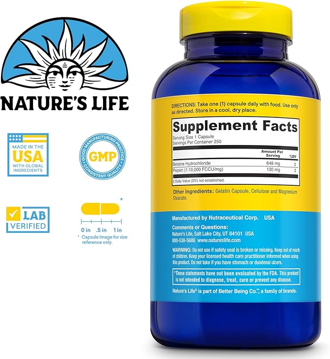 - Enzymes for Digestion & More – Formulated to support digestive health and stomach comfort, Nature's Life HCL Betaine with Pepsin supplies 648mg of Betaine Hydrochloride and 130mg of Pepsin per 1-capsule serving.*