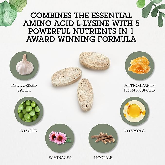 - HERBAL IMMUNE SUPPORT - This complex balance of L-lysine, Vitamin C, Echinacea, Licorice, Propolis, and odorless Garlic help regulate arginine activity and immune systems in your body to maintain wellness.