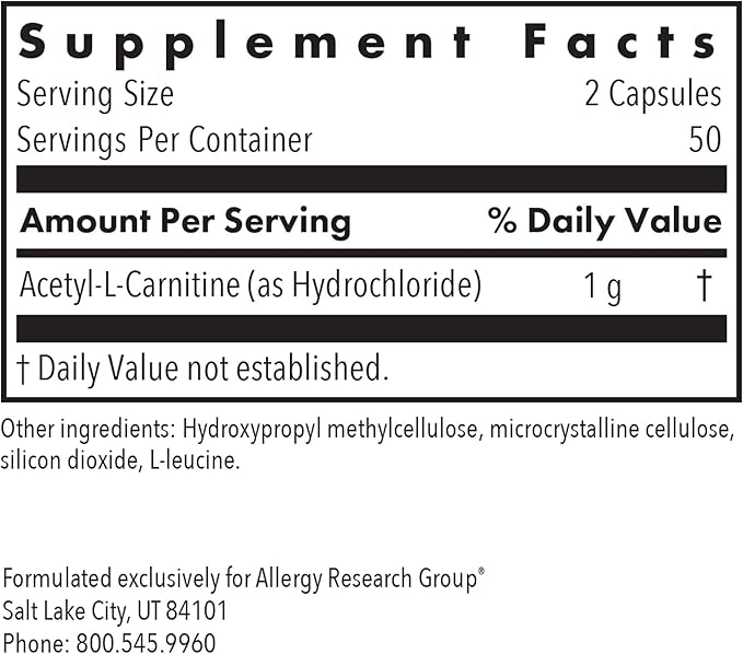 - Flavor : Allergy Research Group Acetyl-L-Carnitine 500mg Supplement - Metabolism and Energy Support, ALC, Free Form Amino Acid, Vegetarian Capsules - 100 Count Allergy Research Group Acetyl-L-Carnitine 500mg Supplement - Metabolism and Energy Support, ALC, Free Form Amino Acid, Vegetarian Capsules - 100 Count