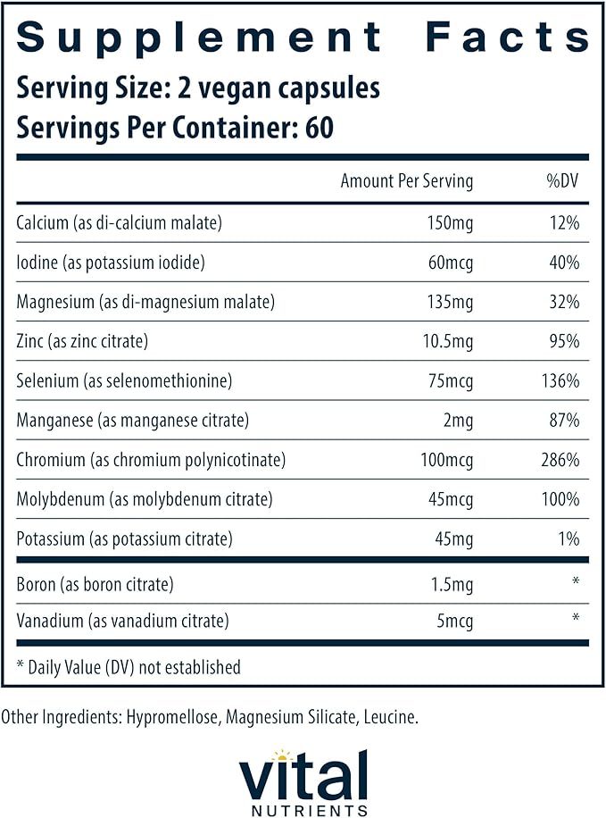 - Premium Multi Minerals Supplement for Men and Women: Vital Nutrients Multi-Minerals is a comprehensive formula offering trace minerals for foundational wellness, in bioavailable citrate and malate forms This iron-free, copper-free formula is well-tolerated, and easier to digest than other mineral forms
