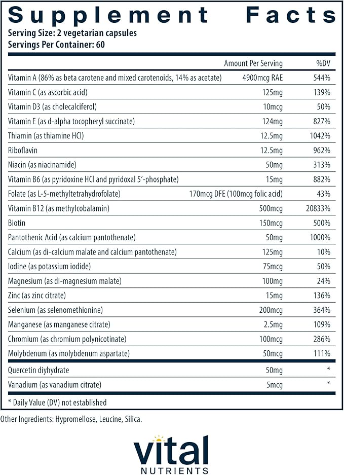 - Full-Spectrum Methylated Multivitamin for Men and Women: Vital Nutrients Multi-Nutrients 5 is a high-potency multivitamin, mineral, and antioxidant formula offering more than 20 nutrients, including B6, B12, and biotin, along with calcium, magnesium, and other essential minerals Its premium ingredients, such as Metafolin L-5-MTHF, methylcobalamin B12, and vitamin D3, ensure optimal absorption and physiological activity
