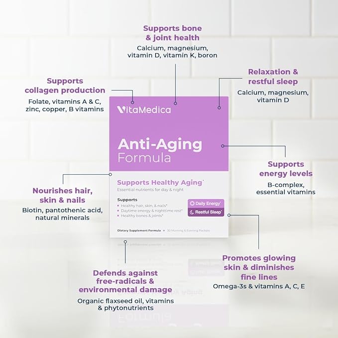 VitaMedica Anti-Aging Formula 4-in-1 Health and Beauty Supplement | Anti Aging Supplement for Women and Men | Healthy Hair, Skin, and Nails | Natural Energy & Restful Sleep | 30 AM & PM Packets