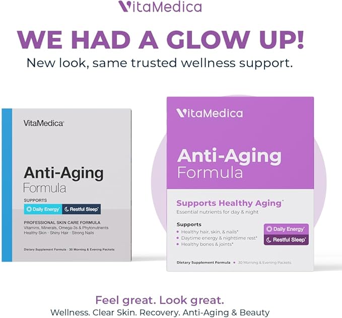 VitaMedica Anti-Aging Formula 4-in-1 Health and Beauty Supplement | Anti Aging Supplement for Women and Men | Healthy Hair, Skin, and Nails | Natural Energy & Restful Sleep | 30 AM & PM Packets