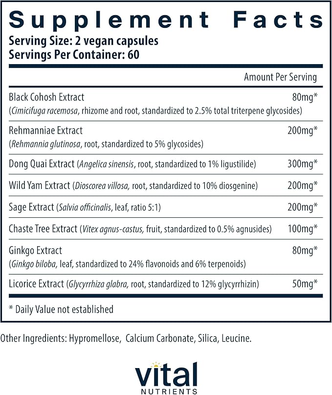 Vital Nutrients Menopause Support | Vegan Supplement for Women | Herbal Complex with Black Cohosh and Vitex Tree Berry for Hormone Balance Support* | Gluten, Dairy, Soy Free | 120 Capsules