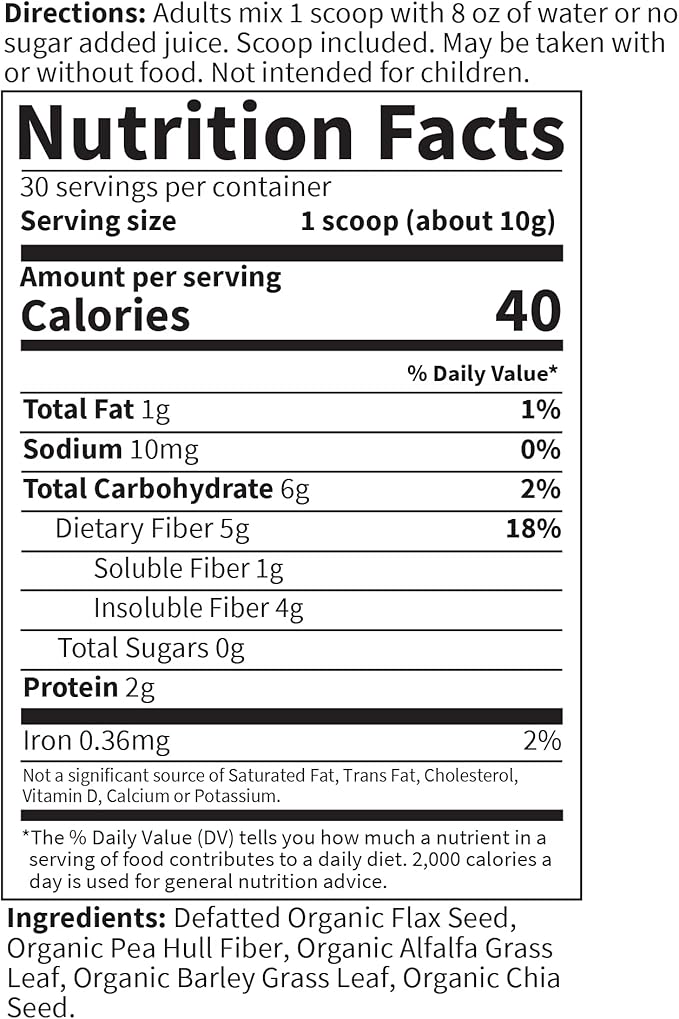- WE’VE GOT THE SCOOP: Our whole food fiber blend provides you with 5g of plant based dietary fiber (4g of insoluble fiber and 1g of soluble fiber) from Organic chia seeds, flax seeds, pea hulls, alfalfa and barley grass in each serving