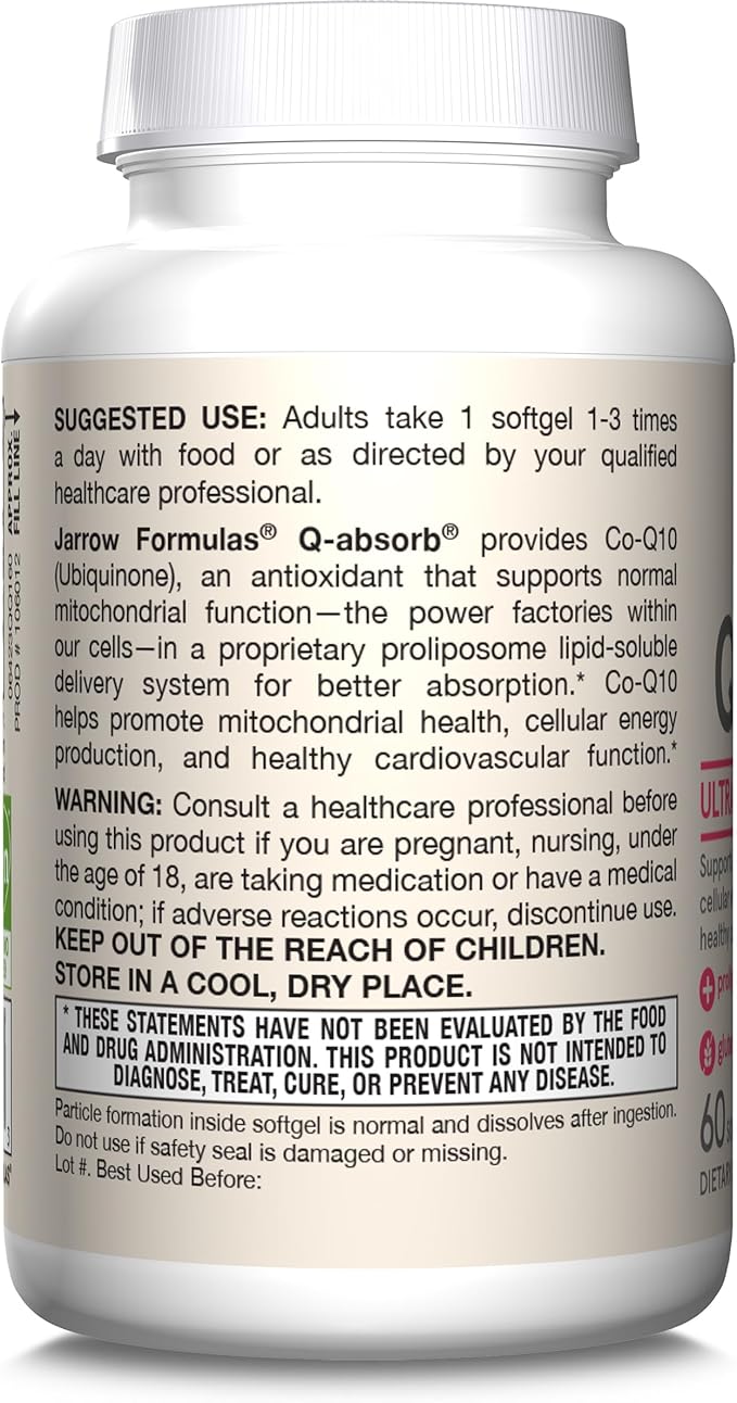 - Daily Wellness Formula: One 60 count bottle of Jarrow Formulas Q-absorb Co-Q10 supplements for 60-day supply