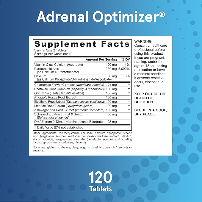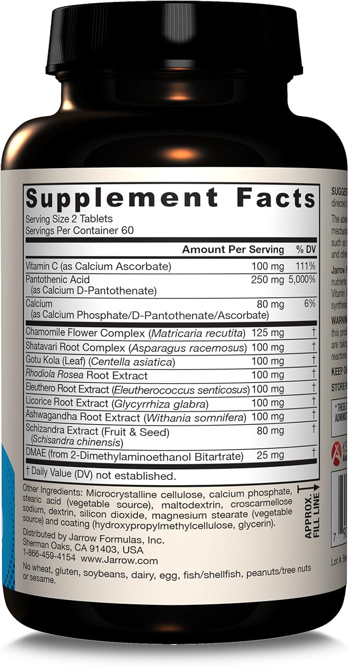 - Mood and Stress Support(1): One 120 count bottle of Jarrow Formulas Adrenal Optimizer with Ashwagandha, Chamomile and Schizandra Extract, Supports Reduction of Occasional Stress(1), 60 Day Supply