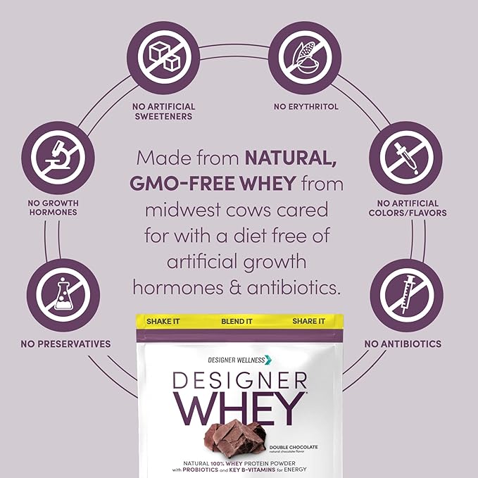 Designer Wellness, Designer Whey, Natural Whey Protein Powder with Probiotics, Fiber, and Key B-Vitamins for Energy, Gluten-Free & Kosher, Double Chocolate, 2 lb