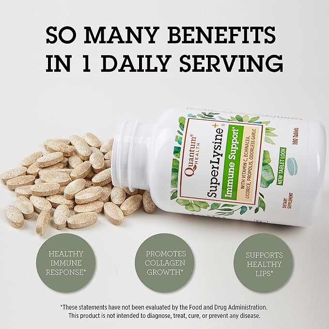 Quantum Health Super Lysine+ / Advanced Formula Lysine+ Immune Support with Vitamin C, Echinacea, Licorice, Propolis, Odorless Garlic (180 Tablets), Packaging may vary
