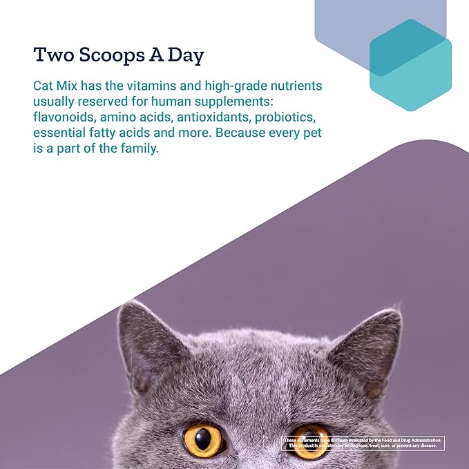 - TWO SCOOPS A DAY – Cat Mix has the vitamins and high-grade nutrients usually reserved for human supplements: flavonoids, amino acids, antioxidants, probiotics, essential fatty acids and more. Because every pet is a part of the family.