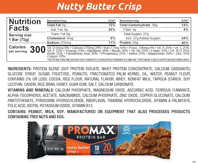 Promax Protein Bar, Nutty Butter Crisp, 20g High Protein, Gluten Free, 12 Count