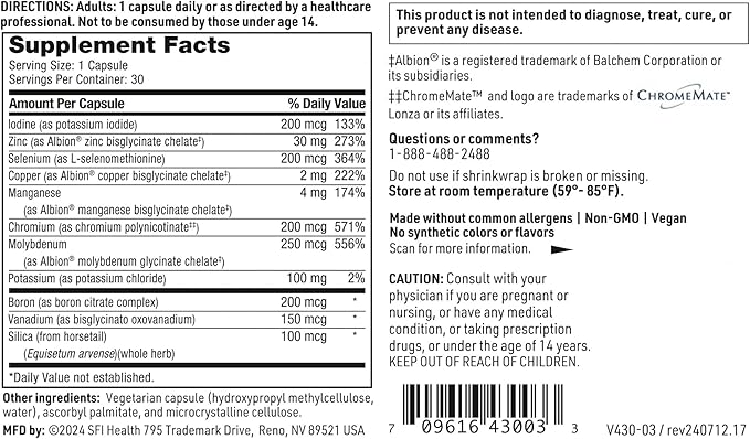- Includes iodine, zinc bisglycinate chelate, Selenium, copper bisglycinate chelate, manganese bisglycinate chelate, Chromium polynicotinate, molybdenum glycinate chelate, Potassium, Boron, Vanadium, and Silicon.