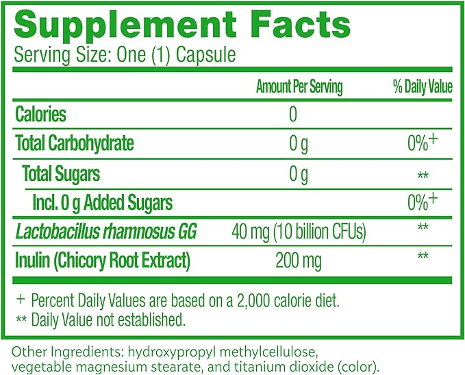 - DAILY DIGESTIVE HEALTH* – LGG is naturally sourced and scientifically proven to work in harmony with your body to keep your digestive system in balance.* Helps with occasional digestive upset; including diarrhea, gas and bloating.* For daily use, take 1 vegetarian capsule per day. Suggested Age: 18 Years and Up