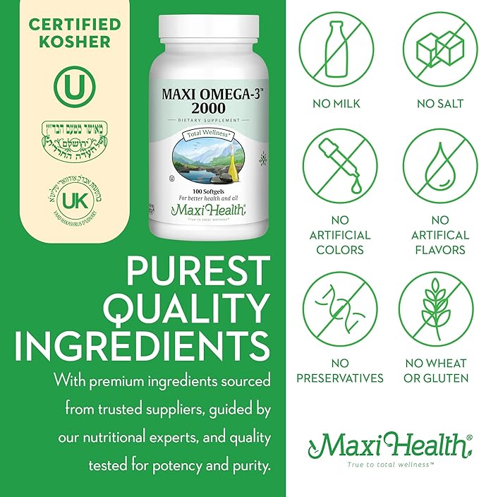 - THIRD-PARTY TESTED FOR TOXINS: Cold Extraction, Molecular Distillation and Filtration, And Rigorous Testing Ensures That Maxi Health’s Burpless Fish Oil 2000mg Omega 3 Supplement Is Free of Harmful Elements Such As Mercury, PCBs, And Other Heavy Metals
