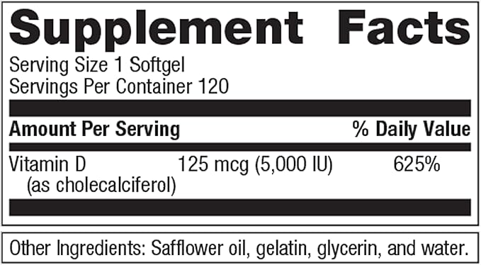 - Vitamin D3 Supplement: Each softgel of Metagenics D3 5000 features 125 mcg (5,000 IU) of vitamin D3