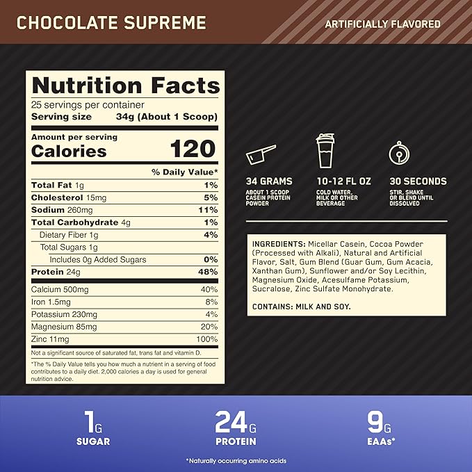 - One 1.87 lb container (25 servings) of Optimum Nutrition Gold Standard 100% Micellar Casein Protein Powder in Chocolate Supreme flavor