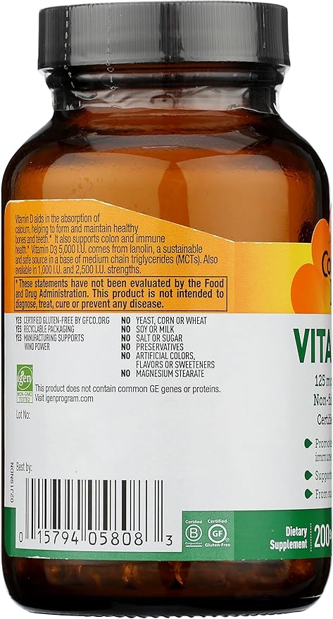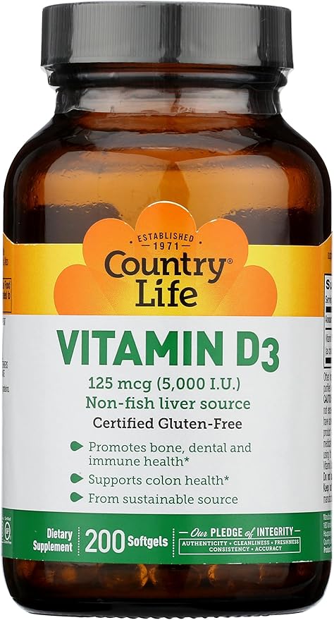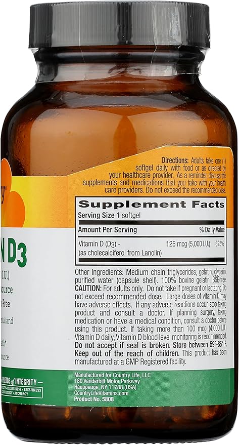 Country Life Vitamin D3 5000 IU for Immune and Bone Health, Calcium Absorption, and Colon Health - Sustainable Source from Lanolin, Available in Various Strengths
