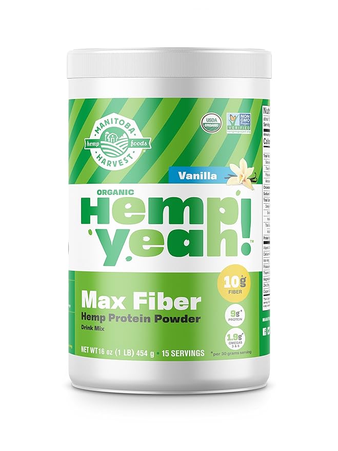 Manitoba Harvest Hemp Yeah! Organic Max Fiber Protein Powder, Vanilla, 16oz; with 10g of Fiber, 9g Protein and 1.9g Omegas 3&6 per Serving, Preservative Free, Non-GMO, Packaging May Vary