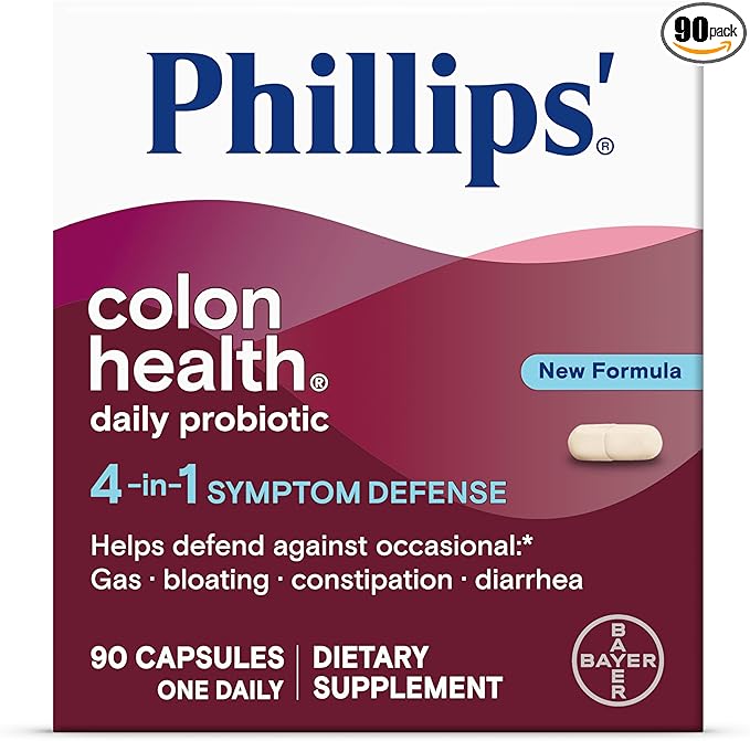 Phillips' Colon Health Daily Probiotic Capsules, 4-in-1 Symptom Defense to Help Defend Against Occasional Gas, Bloating, Constipation, and Diarrhea, Daily Supplement, 90 Count