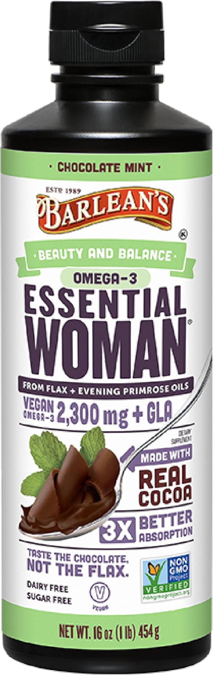 Barlean's Essential Woman Chocolate Mint Liquid Supplement from Flaxseed, Evening Primrose Oil & Soy Isoflavones, Omega 3 6 9 and GLA, Hormonal Balance & Healthy Hair and Skin, 16 oz