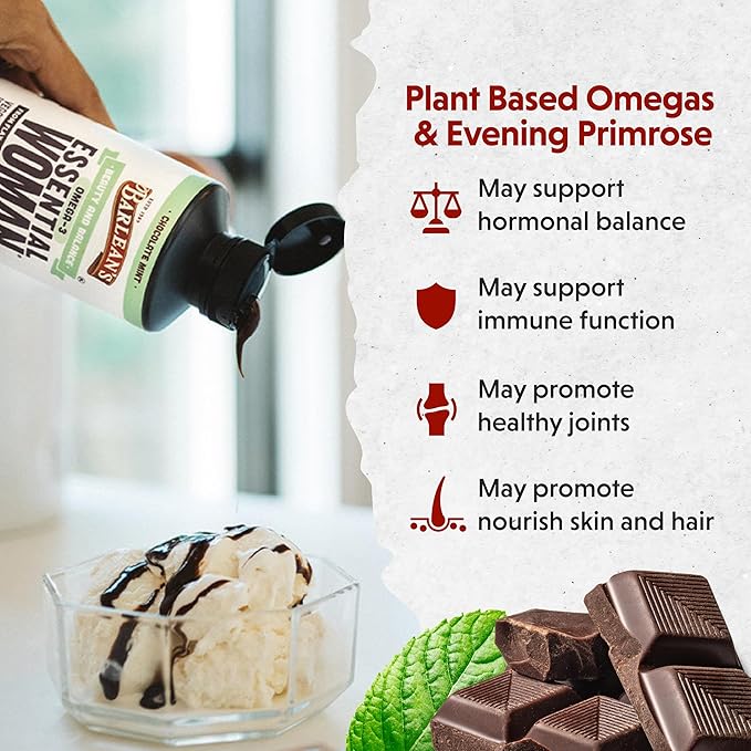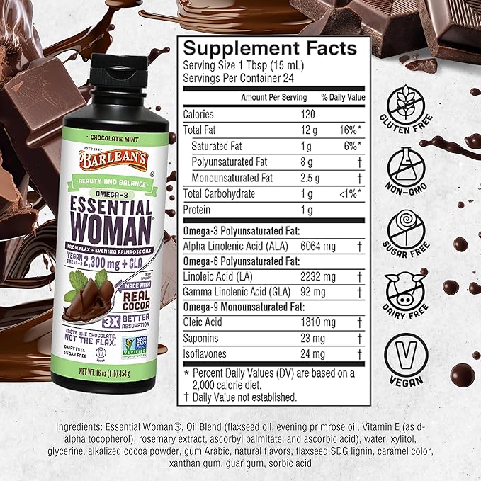 Barlean's Essential Woman Chocolate Mint Liquid Supplement from Flaxseed, Evening Primrose Oil & Soy Isoflavones, Omega 3 6 9 and GLA, Hormonal Balance & Healthy Hair and Skin, 16 oz