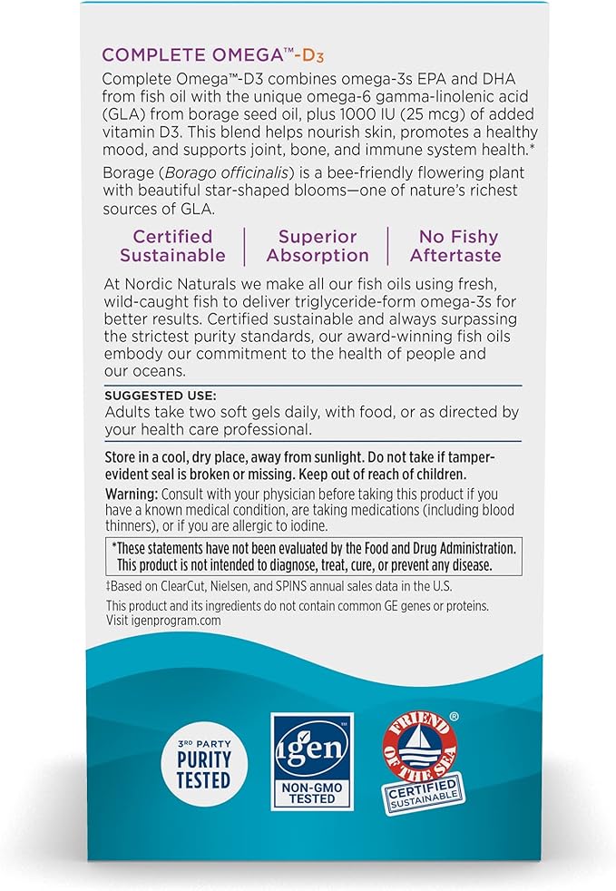 - WHY COMPLETE OMEGA-D3; This formula blends omega-3 EPA + DHA from cold-water fish, Vitamin D3, GLA (gamma linolenic acid) & oleic acid (omega-9) from cold-pressed borage seed oil. It’s a perfectly balanced combination of omegas 3, 6 & 9.