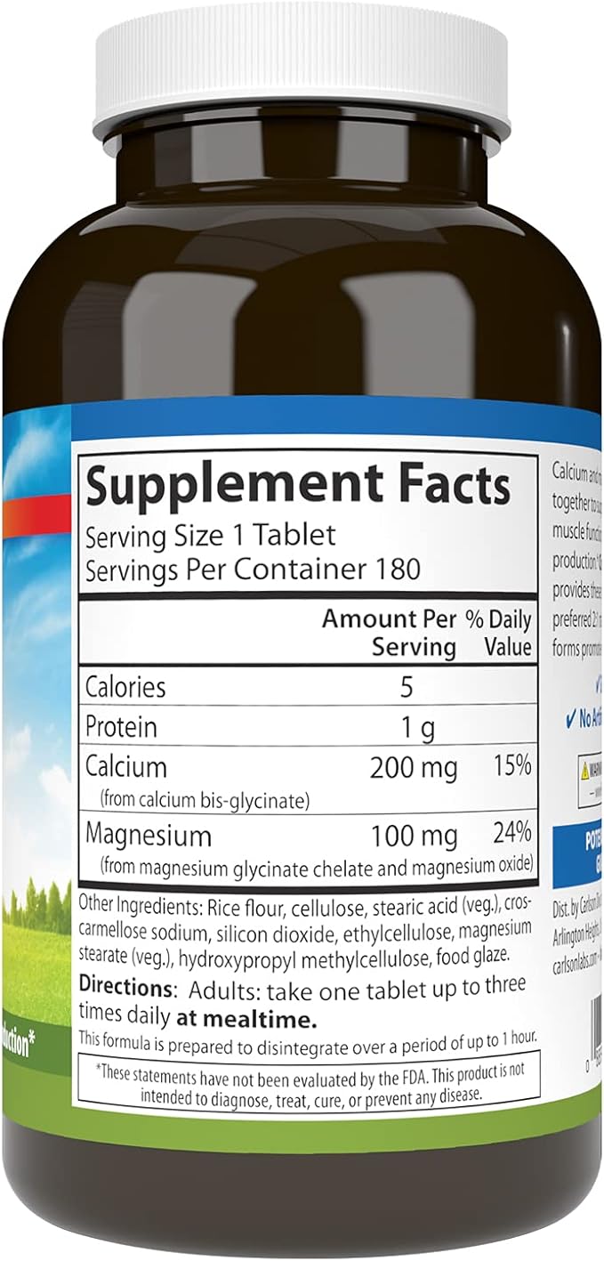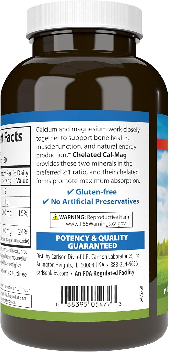 Carlson - Chelated Cal-Mag, 2:1 Calcium to Magnesium Ratio, Bone Support, Muscle Function & Energy Production, 180 Tablets