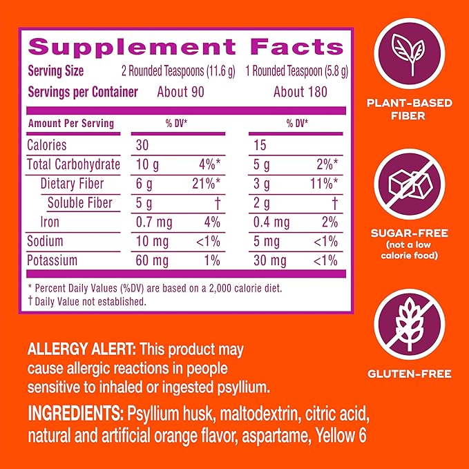 Metamucil 4 in 1 Daily Fiber Supplement Powder, Fiber Powder for Digestive Health and Regularity*, Sugar-Free, Orange, Naturally Sourced Psyllium Fiber, 180 teaspoons