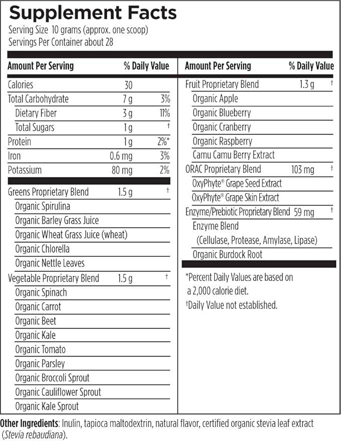 • Greens Powder Drink Mix - A delicious greens food powder packed with fruits and vegetables, along with cleansing alkalizing grass juices, enzymes, and antioxidants.