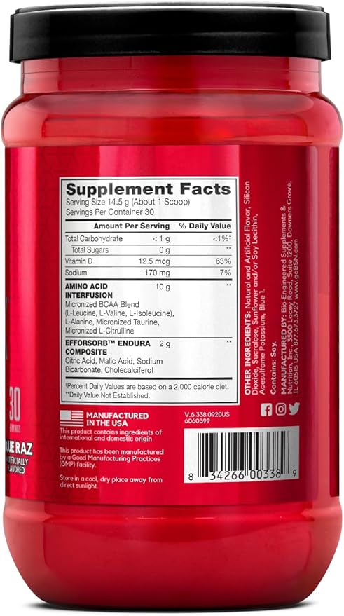BSN Amino X Muscle Recovery & Endurance Powder with BCAAs, Intra Workout Support, 10 Grams of Amino Acids, Keto Friendly, Caffeine Free, Flavor: Blue Raz, 30 Servings (Packaging May Vary)