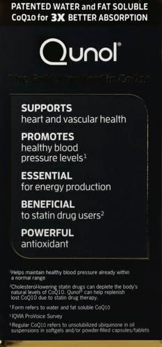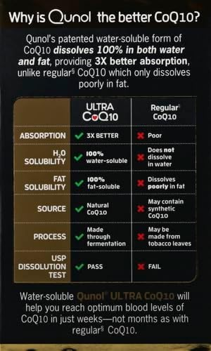 - 100% WATER AND FAT-SOLUBLE: Qunol CoQ10's patented formulation is 100% water and fat-soluble, unlike regular CoQ10 that does not dissolve in water and dissolves very poorly in fat