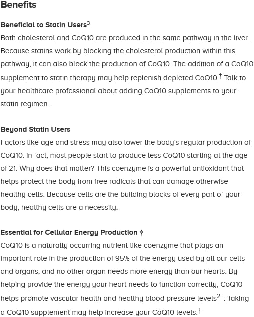 - Product Benefits : Energy Management, Heart Health Support, Vascular Health Support, Antioxidant, Beneficial to Statin Users Energy Management, Heart Health Support, Vascular Health Support, Antioxidant, Beneficial to Statin Users