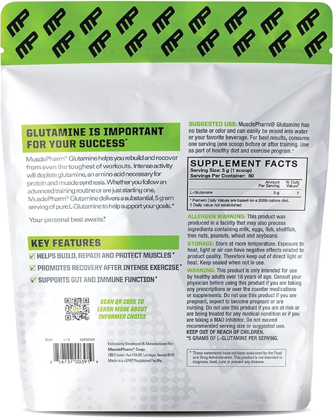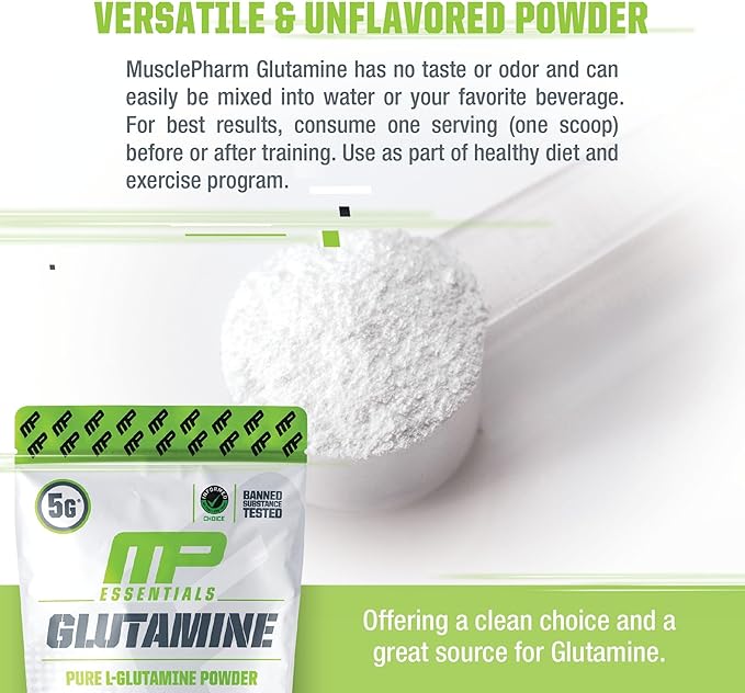 - Unflavored: MusclePharm L Glutamine Powder is tasteless, odorless, and integrates seamlessly into any regimen. Mix with water or your favorite beverage & and enjoy. Consume pre-workout or as a post-workout recovery drink.