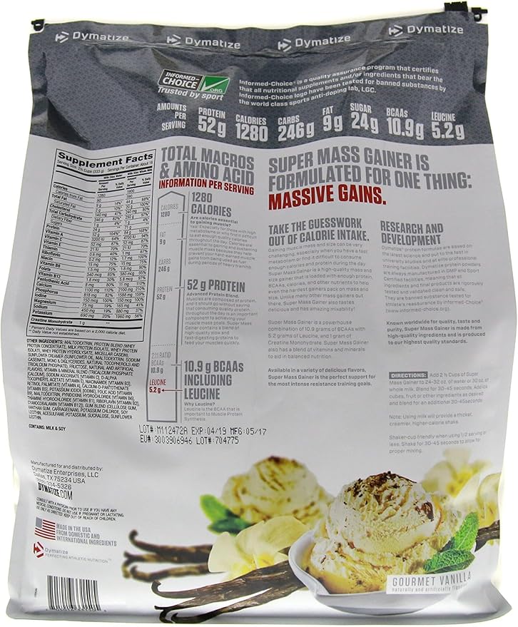Dymatize Super Mass Gainer Protein Powder, 1280 Calories & 52g Protein, 10.7g BCAAs, Mixes Easily, Tastes Delicious, Gourmet Vanilla, 12 lbs