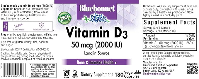 Bluebonnet Nutrition Vitamin D3 2000 IU Vegetable Capsule, Aid in Muscle and Skeletal Growth, Cholecalciferol from Lanolin, D3, Non GMO, Gluten Free, Soy Free, Milk Free, Kosher, 180 Vegetable Capsule