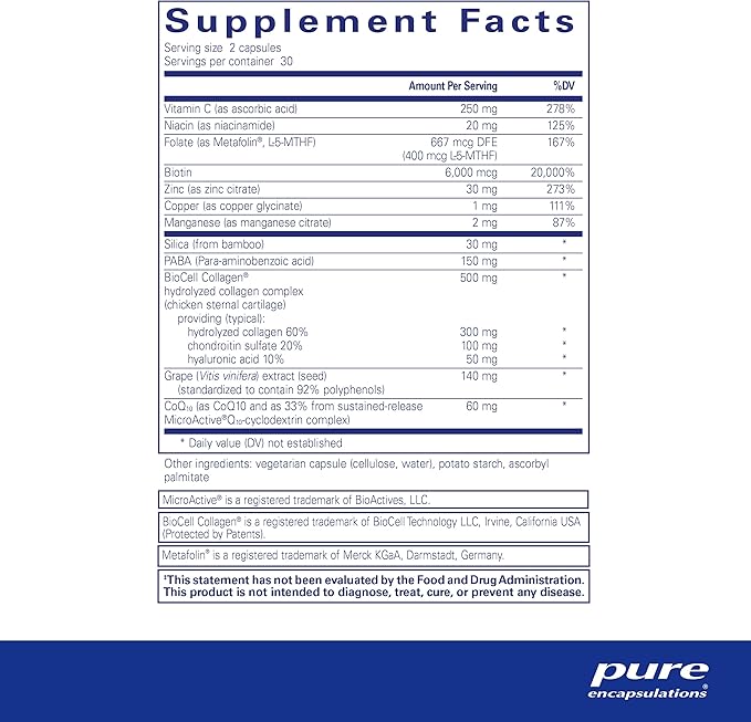 Pure Encapsulations Hair/Skin/Nails Ultra - Supplement for Collagen, Anti Aging, Keratin, Antioxidants, Skin Hydration, Hair, and Nails* - with Biotin, Vitamin C, and More - 60 Capsules