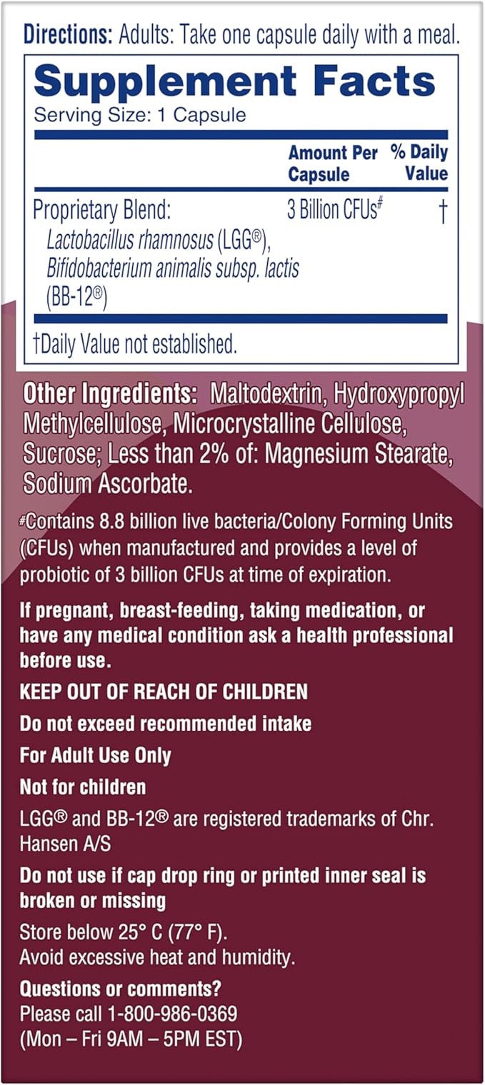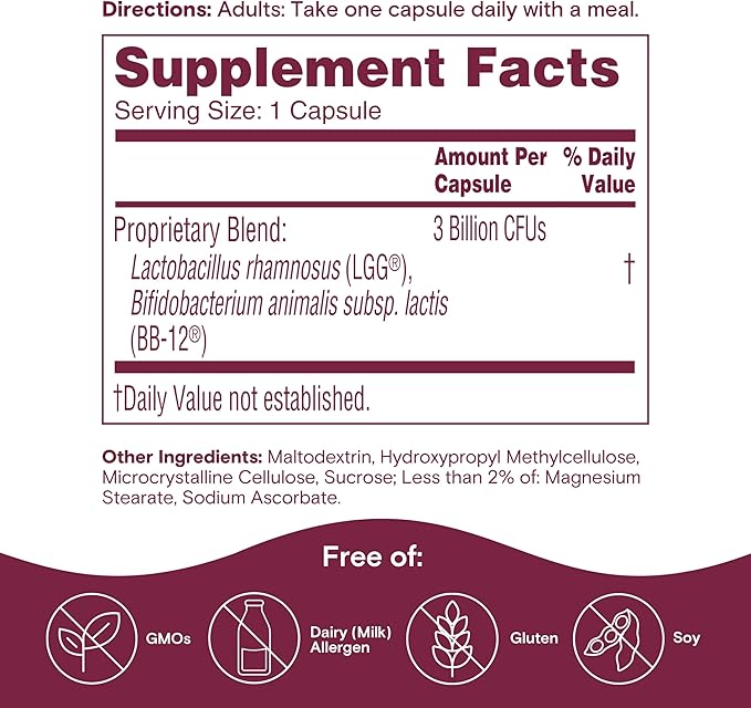 - Contains Specially Selected Probiotics: Lactobacillus rhamnosus (LGG) and Bifidobacterium (BB-12). Non-GMO; Gluten Free; Dairy Free and Soy Free. No refrigeration required
