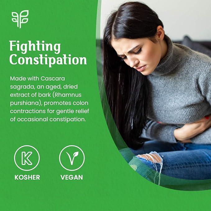 - Key Ingredient: Cascara sagrada, is an aged, dried extract of bark (Rhamnus purshiana). Known for centuries, it facilitates colon contractions, a natural & gentle solution for occasional constipation.