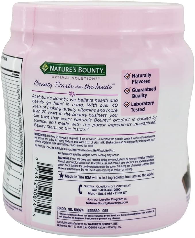 - Contains (1) jar of 16 ounces of Nature's Bounty Optimal Solutions Complete Protein & Vitamin Shake Mix in chocolate. Supports healthy skin, bone health, energy metabolism, muscle health. (1) Provides digestive health support & immune health support