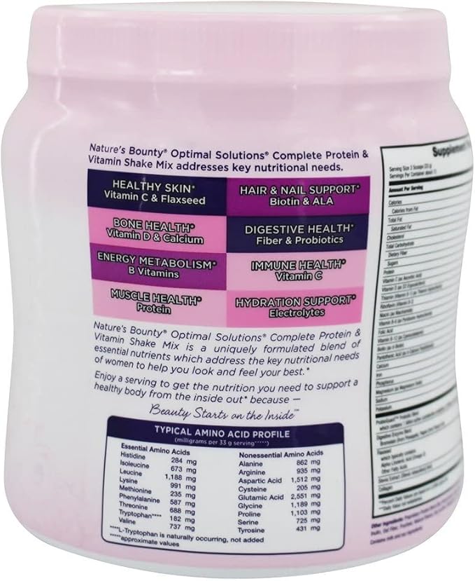 - Nature's Bounty Optimal Solutions Complete Protein & Vitamin Shake Mix contains a nutrient blend that address the key nutritional needs of women to help you look and feel your best. Get the nutrition you need to support a healthy body from the inside out