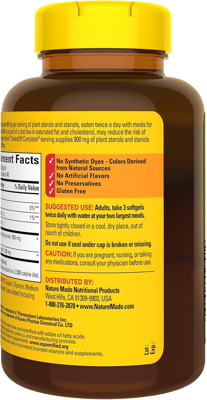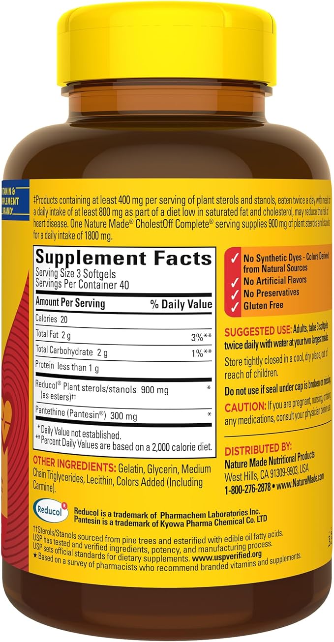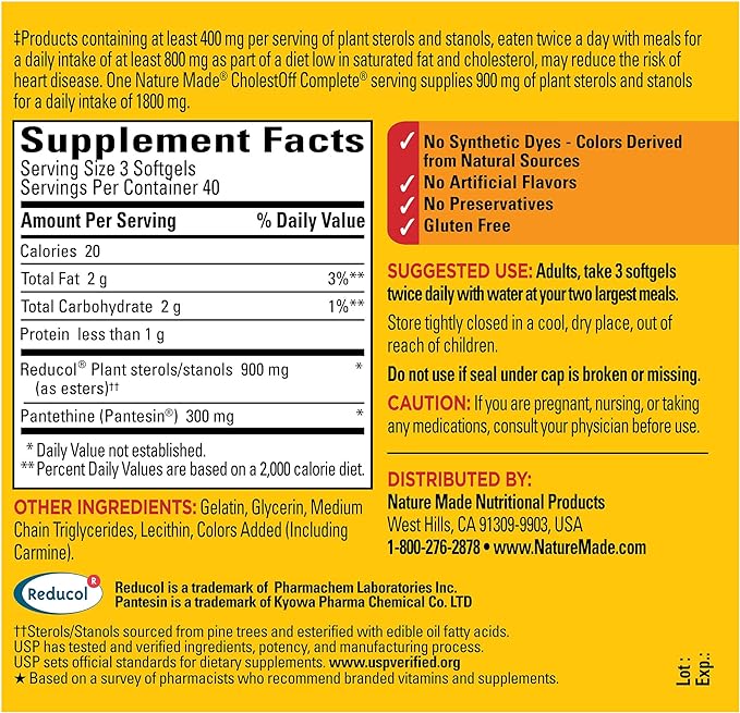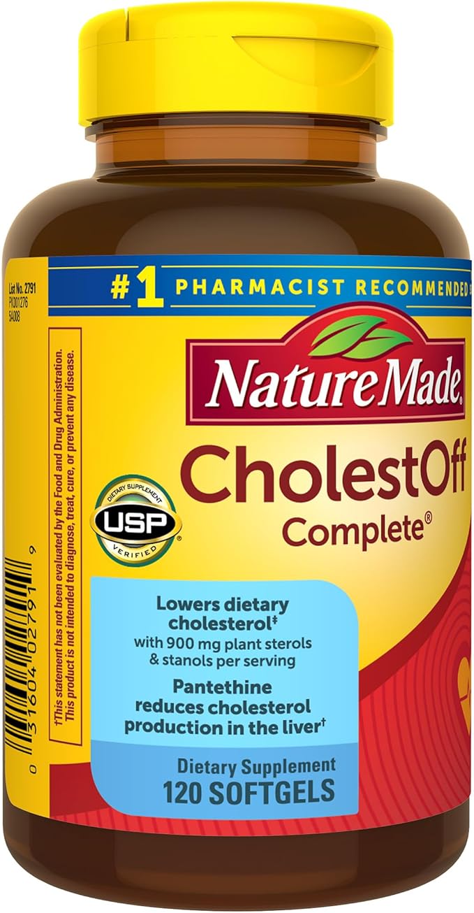 - Heart health support supplement: contains one 120 count bottle of Nature Made CholestOff Complete Softgels for a 20-day supply