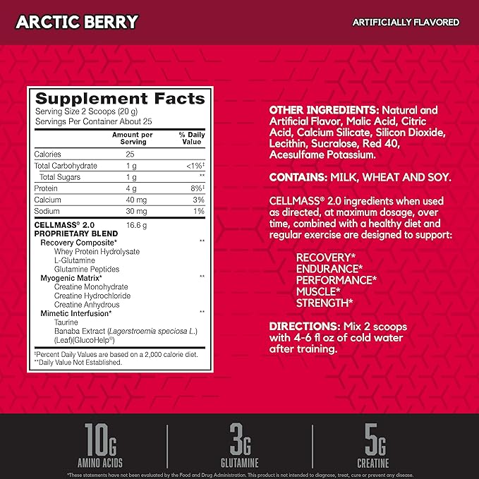 BSN CELLMASS 2.0 Post Workout Recovery with BCAA, Creatine, & Glutamine - Keto Friendly - Arctic Berry, (25 Servings) (1048058)