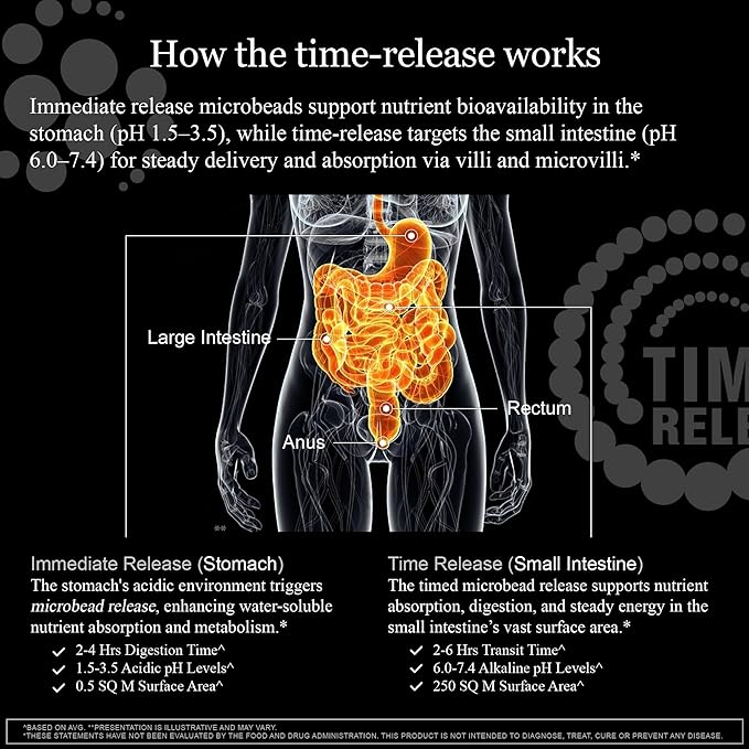 - 3 MICROBEADS: Activated by microbead time-release technology. This protective shield technology is intended to safeguard delicate nutrients against degradation by stomach acid, helping preserve their potency for targeted delivery and sustained effectiveness.*
